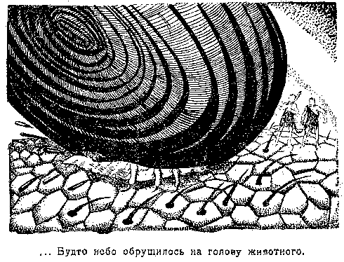К его счастию, до драки дело не дошло. Животному оставалось сделать один единственный шаг, чтобы раздавить беглецов, – в это время… его самого раздавили… Будто небо обрушилось на его голову. Приятели покатились оглушенные и ослепленные вонючей жидкостью, брызнувшей из размозженного тела животного. Падая, они заметили, что «небо» имело бороздчатое строение и розовый цвет. Потом оно так же внезапно исчезло, как и появилось, оставив вместо себя кляксу на почве и лужу бурой крови.