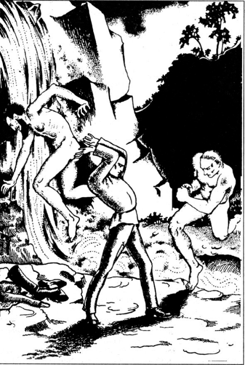 Прошло минут пять, пока последняя часть туалета не была снята с распаренных тел. За это время рабфаковец успел приблизиться еще шага на три. Подобраться ближе он не мог, так как заросли обрывались в полутора саженях от водопада. Теперь голые авантюристы стояли на краю водопада вполуоборот к невидимому наблюдателю и давали себе остыть прежде, чем окунуться в пенистую, клокочущую влагу.
