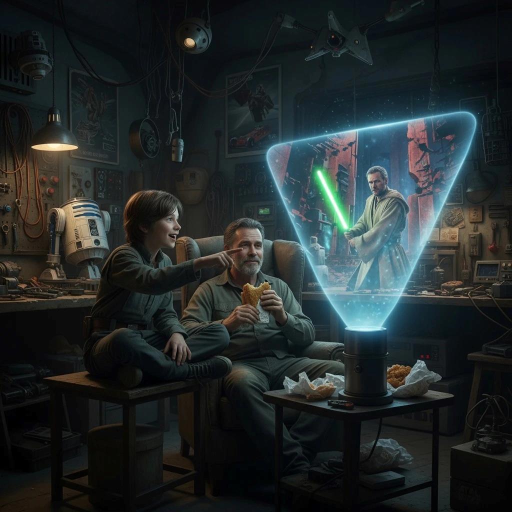 Дядя Гаррек сидел в старом кресле перед небольшим голоэкраном, держа в руках тарелку с дымящейся едой сомнительного вида. На экране разворачивался типичный боевик – джедай в традиционных одеждах сражался с группой ситхов в темном храме.
