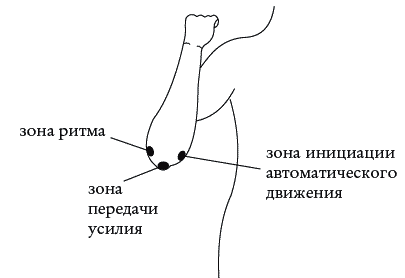 На внутренней стороне локтя расположена зона передачи усилия – локтевой отросток локтевой кости, на внешней стороне – зона передачи ритма – головка лучевой кости. На внутренней стороне локтя расположена также зона вызова автоматических движений (рис. 11).