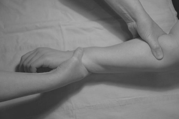 Наиболее простые приемы – приемы воздействия на трубчатые кости конечностей. Техники воздействия на трубчатые и плоские кости во многом совпадают, а отличаются следующим: трубчатые кости сжимают по длиннику кости. Одну руку помещаем на один конец кости, вторую руку – на другой конец кости и производим ритмичные сжатия толчками одной рукой. Одна рука фиксирует кость, а вторая рука толкает кость (фото 12).