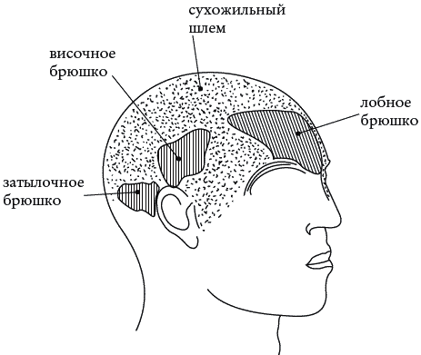 Надчерепная мышца состоит из сухожильной и мышечных частей. Крышу черепа покрывает сухожильная часть, которая называется сухожильным шлемом, или надчерепным апоневрозом. Передние порции надчерепной мышцы называются лобными, задние – затылочными, а боковые – ушными. Переднее брюшко заканчивается в коже бровей. К ушным мышцам прикреплены ушные раковины (рис. 12).