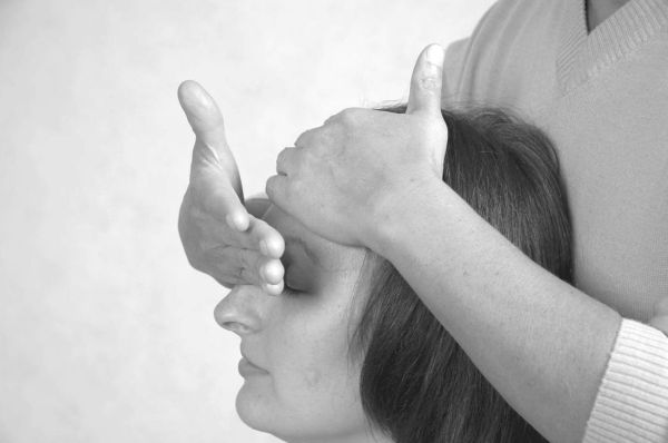 Техника воздействия. Встаньте за спиной у пациента. Вставьте средние пальцы рук в наружные слуховые проходы, а большим, указательным, безымянным и мизинцем обопритесь о затылочную кость. На выдохе мягкими движениями толкните заднюю часть слухового прохода к затылочной кости. Дайте возможность пострадавшему передохнуть 2–3 минуты.