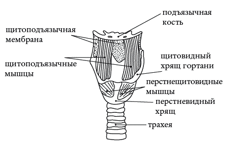 В дополнение к растяжению щитоподъязычных мышц и щитоподъязычной мембраны желательно растянуть небольшие, но очень важные для функции гортани перстнещитовидные мышцы, лежащие под щитовидным хрящом (кадыком). Щитоподъязычные мышцы тянут кадык кверху, а перстнещитовидные мышцы тянут кадык книзу. Баланс усилий, прикладываемых к щитовидному хрящу, легко нарушается даже при незначительных остаточных напряжениях в этих маленьких мышцах. Дисбаланс усилий на щитовидном хряще искажает голос: голос становится сдавленным и неестественным. Кроме того, дисбаланс напряжений в мышцах и соединительнотканных образованиях гортани вызывает нарушения тонуса мышц во всем теле.