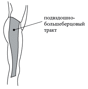 Верхний конец тракта прикреплен к гребню подвздошной кости, а нижний конец – к нижнебоковой поверхности большеберцовой кости. Тракт является накопителем напряжений, возникающих в мышцах и костях таза и бедра. Подвздошно-большеберцовый тракт вверху примыкает к апоневрозу широчайшей мышцы спины (рис. 15).