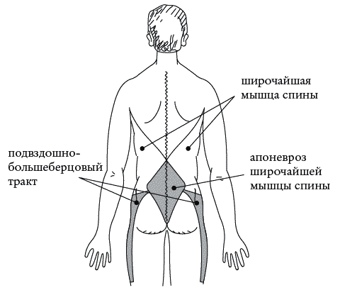 Апоневроз широчайшей мышцы спины крепится к гребню подвздошной кости и к поясничным позвонкам, а вверху широчайшая мышца крепится к плечевой кости. Таким образом подвздошная кость находится под влиянием двух мощных тяг и накопителей напряжений: широчайшей мышцы спины с ее апоневрозом и подвздошно-большеберцового тракта (без учета влияния других мышц и тяг, действующих в тех же направлениях).