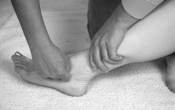 Техника воздействия на таранную кость. Обхватите область таранной кости снизу изнутри и снаружи основаниями кистей и на полном выдохе медленными сжимающими движениями воздействуйте на таранную кость (фото 36).