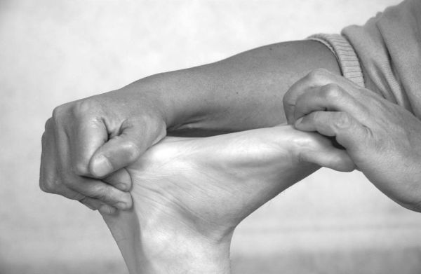 Техника воздействия. Одной рукой зафиксируйте пяточную кость, а второй рукой обопритесь о головки икроножной мышцы и растягивайте сухожилие мышцы.