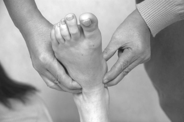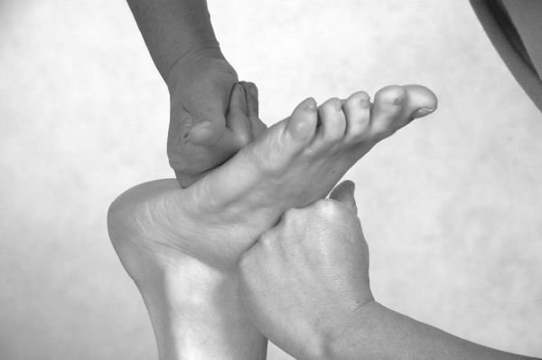 Техника воздействия. Одной рукой зафиксируйте пятку, а второй рукой захватите кости плюсны и медленными ритмичными движениями растяните стопу (фото 35).