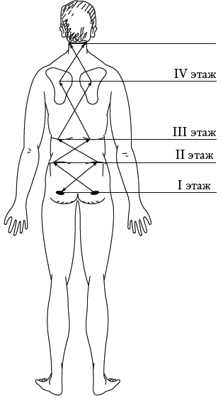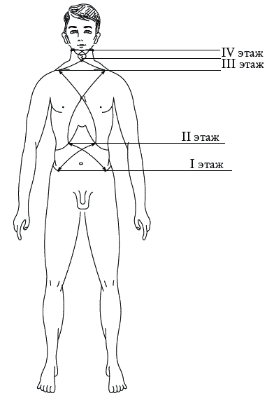 Система «дорожка» основана на принципе деления туловища на естественные этажи согласно входам-выходам коммуникантных потоков. Тело от паха до черепа разделено на четыре этажа. На передней поверхности тела границы этажей проходят по следующим ориентирам (рис. 16).