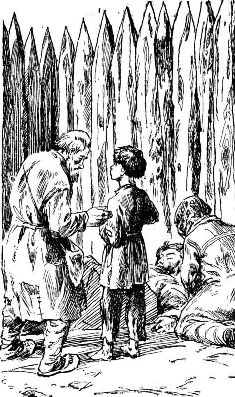 Караульные, не обращая внимания на пленников, подходивших к ведру, продолжали играть. Филька принес напиться дедушке Миките, который, кажется, так ослабел, что не мог подняться. «Не всю же ночь караульные будут играть, и им спать захочется. Тогда навалиться на обоих. Или лучше – вон копья прислонили к стене, – подкрасться и заколоть». Филька, что подумал, то и сказал Екиму.