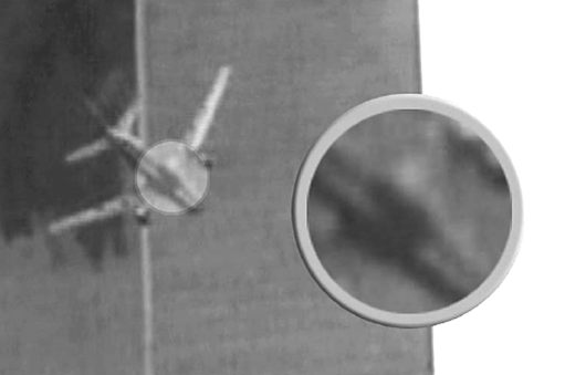 Вторая аномалия на последнем кадре рис. 4 – это яркая точка, отчетливо видная в тот момент, когда самолет врезается в здание. Причем она несколько смещена вправо от центра лайнера и находится с таинственным утолщением на прямой линии, параллельной фюзеляжу.