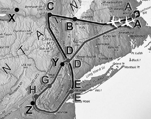 Задача подмены одного самолета другим, по сути, сводится к тому, чтобы с выбранной авиабазы поднялся «дублер» и, обманув авиадиспетчеров, занял место исходного пассажирского лайнера. На приведенной схеме (рис. 10) показаны пути следования рейсов АА11 и UA175, наложенные на рельеф местности. Данные получены от Национального управления по безопасности перевозок (National Transportation Safety Board – NTSB), организации, которая занималась анализом маршрутов «угнанных» самолетов. Путь АА11 помечен точками A-B-C-D-E, путь UA175 – точками A-D-G-H-E. Здесь есть два очень занимательных момента.