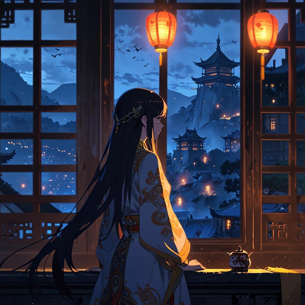 Не ангел, скорее, девушка, юная и невесомая, словно сотканная из сумерек и лунного света. Длинные, иссиня-черные волосы, заплетенные в тяжелую косу, ниспадали до самой земли. Ее лицо казалось почти бескровным, фарфорово-бледным, но на нем горели огромные, раскосые, почти миндалевидные глаза. Они были темнее самой глубокой ночи, и в них плескалась неземная, всепонимающая печаль. Одетая в простое восточное платье цвета слоновой кости, она казалась нереальной, видением, пришедшим из древней легенды.