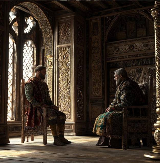 Киев, княжеский терем. Сквозь узкие окна пробивается утренний свет, высвечивая пылинки в воздухе. Игорь, восседая на троне, потягивает медовуху из резного кубка. Киевский трон больше похож на грубо сколоченную скамью, чем на символ власти. Игорь мечтает заменить эту неудобную штуку на нечто более подходящее. Предыдущий Великий князь этим не озаботился, Святославу все походы нужны были. А Игорь – другой. На его лице играет легкая, едва уловимая ухмылка. Перед ним, чуть поодаль, стоит Драган, в потрепанных одеждах, но с узнаваемой выправкой наемника. Его уставшая поза говорила о том, что его тело еще не совсем отошло от пережитого. А на лице читается смесь недоумения и осторожного интереса.