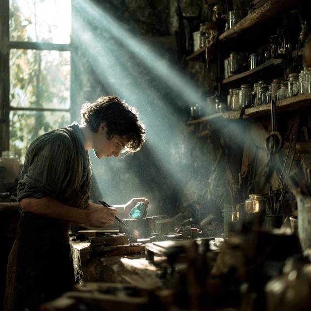 Подойдя к одному из ящиков, я погрузил руку в холодную, колючую массу. Пальцы скользили по острым, режущим граням одних кристаллов, мыльной поверхности других, шершавой корке третьих. Рука словно утонула в мертвой крупе. Кончики пальцев, натренированные тысячами часов, считывали внутреннюю структуру, плотность, малейшие вибрации. Этот – пустой. Этот – хрупкий. Этот… Внезапно они замерли, нащупав его. Он был не таким ледяным, как остальные. Чуть теплее, словно внутри него тлел уголек. Я вытащил его на свет. Неприметный, зеленовато-бурый кристалл размером с голубиное яйцо, с тусклой, маслянистой поверхностью и цветом мутной воды в заброшенном пруду.