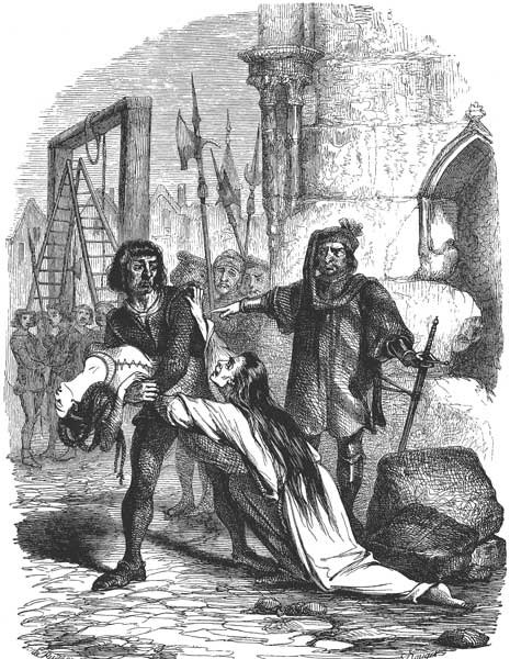 Мать, голова которой зарылась в одежды дочери, не промолвила ни слова; только видно было, как дрожало все ее тело, как жадно и торопливо целовала она свою дочь. Палач воспользовался этой минутой, чтобы быстрее разомкнуть ее руки, которыми она сжимала осужденную. То ли обессилев, то ли отчаявшись, она не сопротивлялась. Палач взвалил молодую девушку на плечо, и тело прелестного создания, грациозно изогнувшись, запрокинулось за его большую голову. Потом он вступил на лестницу, собираясь подняться.