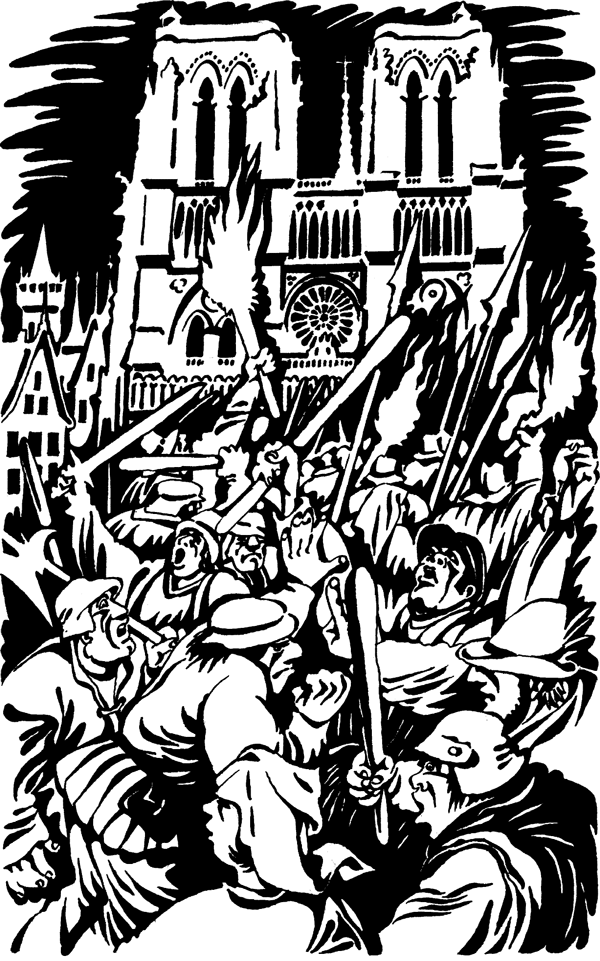 Тем временем площадь зажглась тысячью факелов. Беспорядочная картина боя, до сей поры погруженная во мрак, внезапно озарилась светом. Соборная площадь сверкала огнями, бросая их отблеск в небо. Костер, разложенный на верхней площадке, продолжал полыхать, далеко освещая город. Огромный силуэт башен четко выступал над крышами Парижа, образуя издали на этом светлом фоне широкий черный выем. Город, казалось, всколыхнулся. Со всех сторон доносился стонущий звон набата. Бродяги, рыча, задыхаясь, богохульствуя, взбирались наверх, а Квазимодо, бессильный против такого количества врагов, дрожа за жизнь цыганки и видя, как все ближе и ближе подвигаются к его галерее разъяренные лица, в отчаянии ломая руки, молил Небо о чуде.