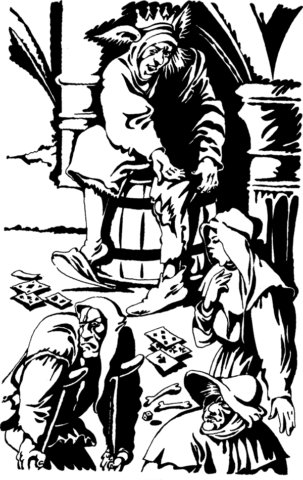 Повсюду слышались раскаты грубого хохота и непристойные песни. Люди судачили, ругались, твердили свое, не слушая соседей, чокались кружками, а под их стук вспыхивали ссоры, и тогда драчуны разбитыми кружками рвали друг на друге рубища.