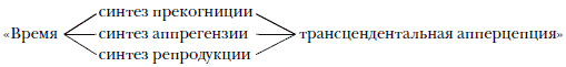 [Закрыть]и которую он сопоставляет со схемой «Критики чистого разума» (как будто последняя не есть также интерпретация), видно, что время разлагается на три составляющие, т. е. три синтеза (прекогниции, поставленного на первое место, аппрегензии и репродукции), единство которых затем результируется в трансцендентальной апперцепции