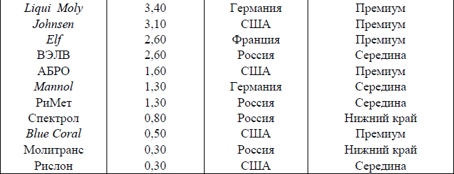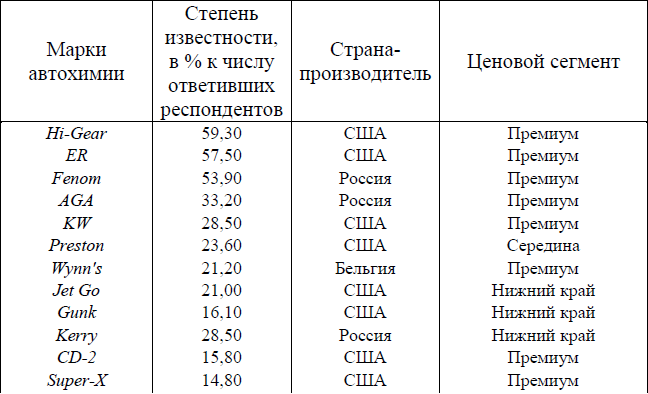 Были проведены опросы 550 респондентов на предмет степени известности среди автомобилистов средств автохимии, представленных на российском рынке, результаты которого представлены в табл. 2, с указанием страны – производителя и ценового сегмента.