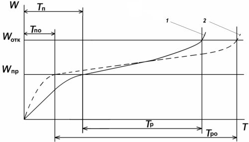 Рис. 7. Кривые межремонтного цикла эксплуатации техники с применением ( 1) и без применения ( 2) обкаточных присадок: Wотк – показатель наступления неработоспособного состояния (отказа) объекта; Wпр – показатель завершения приработки объекта; Тп – продолжительность штатной приработки (без присадок); Тпо – продолжительность приработки с присадкой; Тр – межремонтный ресурс объекта со штатной обкаткой; Тро – межремонтный ресурс объекта с обкаткой на присадках
