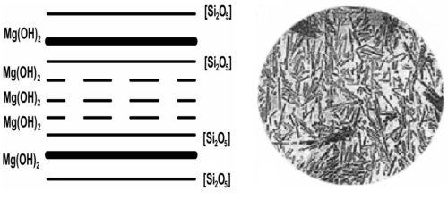 Рис. 10. Слоистая структура строения серпентина (слева) и волокна хризотила под электронным микроскопом (справа)