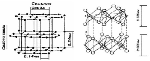 Рис. 12. Слоистая структура кристаллической решетки графита (справа) и дисульфида молибдена (слева)