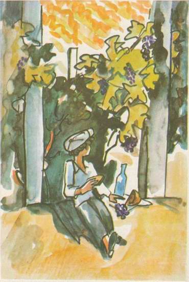 Тут, в тени виноградных лоз, обвивавших бетонные столбы, веяло приятной прохладой. Из гущи виноградных листьев аппетитно выглядывали крутые гроздья чёрного винограда, подёрнутого тончайшей жемчужной пылью. И вдруг ему очень захотелось винограда с сыром и хлебом.