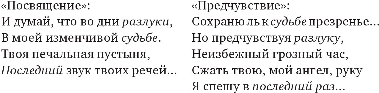 Третий пример переклички: в «Посвящении» поэт наделяет свою избранницу «душою скромной». А в стихах к Олениной, например, в стихотворении «Ее глаза», он видит в ней «детскую простоту», «скромную грацию», сравнивает с «ангелом Рафаэля», в стихотворении же «Предчувствие» называет ангелом: «мой ангел», «ангел кроткий, безмятежный». Но ведь эти стихи создавались параллельно с работой над поэмой!