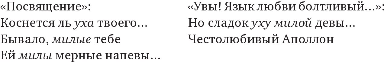 Другим примером может служить слово «нежность» и образуемые от него эпитеты. Ведь «Посвящение» содержало в черновой рукописи признание: «J love this sweet name (Я люблю это нежное имя)». Характерно, что и в стихах, обращенных к Олениной, весьма часто встречаются «нежности»: «И сколько неги и мечты!..» («Ее глаза»); «С улыбкой нежною прочтешь…» («Увы! Язык любви болтливый…»); «Опечалься: взор свой нежный…» («Предчувствие»); «Я вас любил так искренно, так нежно…» («Я вас любил, любовь еще, быть может…»). Известно, кроме того, что при выборе имени для героини поэмы Пушкин останавливал свое внимание и на имени Анна.