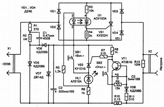 При наличии тока в цепи более 10 А устройство автоматически срабатывает и нагрузка, подключенная к разъему Х2, обесточивается. При подключении электронного предохранителя к сети 220 В на его узел управления подается питающее напряжение – 12 В. Ток течет через резистор R6 и светоизлучатель оптрона U1, так как транзистор VT1 и тринистор VS2 закрыты. В этот момент открывается фотодинистор оптрона и ток начинает течь через него и резистор R3. Напряжение, выпрямленное мостом VD1…VD4, подается на управляющий электрод тринистора VS1. После открытия тринистор VS1 замыкает диагональ моста и открывает путь сетевому напряжению к нагрузке. В момент превышения тока нагрузки или коротком замыкании в ее цепях падение напряжения на резисторе R10 приводит к открытию транзистора VT1 и тринистора VS2. Тринистор своим малым сопротивлением шунтирует цепь питания светоизлучающего оптрона, что приводит к закрытию фотодинистора оптрона и тринистора VS2. В результате происходит обесточивание нагрузки, о чем свидетельствует загорание светодиода HL1. Для включения электронного предохранителя служит кнопка SB1. В момент нажатия кнопки SB1, когда ее контакты замыкаются тринистор VS2 закрывается, но электронный предохранитель еще остается невключенным, так как цепь питания светоизлучающего оптрона зашунтирована. И лишь при отпускании кнопки, когда ее контакты размыкаются, сетевое напряжение подается на нагрузку. Такое построение схемы позволяет не допустить выхода из строя устройства, а также в случае попытки его включения при коротком замыкании. Для необходимости ручного отключения нагрузки в электронном предохранителе имеется кнопка SB2. В устройстве могут быть использованы следующие радиодетали. Резистор R10 представляет отрезок провода ПЭВ-1 диаметром 0,6 мм длиной 2 м, который намотан на корпус мощного резистора. Все остальные резисторы типа МЛТ, рассчитанные на мощность, указанную на схеме. Конденсатор С1 типа К73-17, а С2 и С3 – К50-6. Диоды VD1…VD4, кроме указанных на схеме, могут быть серий Д232, Д233, Д247, КД203, КД206 и другие на Uобр. мах не менее 400 В. Вместо диодов КД209Б (VD5,VD6, VD8) подойдут диоды серии КД102, а стабилитрона Д814Д (VD7) можно применить – Д814Г, Д813, Д811, КС213 и другие с напряжением стабилизации 10…12 В. Тринистор КУ101 (VS2) использовать с любым буквенным индексом, КУ202 (VS1) – с индексами К…Н. Транзистор VT1 из серии КТ361, КТ209, КТ201, КТ502, КТ501, КТ3107 и подобные. Кнопки SB1 и SB2 типа П2К без фиксации. Тринисторы VS1 и диоды VD1…VD4 следует установить на плоских алюминиевых радиаторах размерами 50x80x5 мм. Основная часть деталей устройства монтируется на печатной плате размером 72x52 мм, вырезанной из одностороннего фольгированного стеклотекстолита. Плата размещается в корпусе, в котором на лицевой его стороне установлены кнопки SB1 и SB2, светодиод HL1 и розетка X1. Собранный правильно из исправных деталей электронный предохранитель в налаживании не нуждается. Для установки требуемого порога срабатывания устройства необходимо подобрать тринистор VS1 и резистор R10 исходя из того, что Iкз < Iср. мах. При этом сопротивление резистора R10 определяют из формулы: