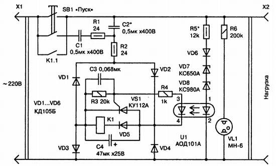 Устройство отключает нагрузку от сети при «скачках» питающего напряжения, повторное его включение возможно только при нажатии кнопки SB1. Основой устройства защиты аппаратуры является мощное электромагнитное реле K1, которое включено в одну из диагоналей выпрямительного моста VD1…VD4. Выпрямительный мост подключен к сети через гасящие конденсаторы C1 и С2. Как было уже сказано, устройство включается кратковременным нажатием кнопки SB1. В этот момент срабатывает реле К1 и его замыкающие контакты K1.1 блокируют контакты пусковой кнопки. Необходимый при включении пусковой ток реле обеспечивается конденсатором C1. Реле К1 удерживается в рабочем режиме при падении напряжения сети до 160 В током, проходящим через конденсатор С2. В момент повышения напряжения сети до 240 В происходит открытие стабилитронов VD7 и VD8. Одновременно срабатывает оптрон U1 и открывается тринистор VS1, который блокирует цепь питания обмотки реле К1 и его контакты K1.1 отключают нагрузку от питающей сети переменного тока. Быстродействие устройства составляет доли секунды и зависит от типа применяемого реле. С целью улучшения быстродействия устройства в его схему введен диод VD5. онденсатор СЗ в цепи управления тринистором VS1 служит для предотвращения срабатывания защиты от импульсных помех. В устройстве использованы конденсаторы С1 и С2 типа К73 на номинальное напряжение не менее 350 В, резисторы типа МЛТ. Диодный оптрон АОД101А можно заменить на транзисторный серии АОТ110 или АОТ127, соединив резистор R4 с эмиттером фототранзистора, анод тринистора VS1 – с выводом его коллектора, а между базой и эмиттером установить резистор сопротивлением 1 МОм. В этом случае тринистор может быть с большим током управления, например, серии КУ201 или КУ202. Реле К1 типа РЭН33 с временем отпускания 4 мс. В принципе реле может быть любого типа на рабочее напряжение 12…60 В. Контакты реле должны быть рассчитаны на ток не менее 2…3 А при напряжении 20 В. Кнопка SB1 типа КМ2-1 или П2К без фиксации.