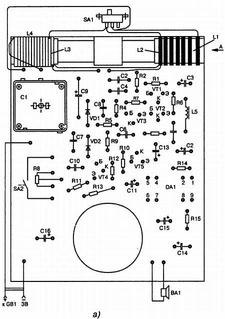 Промышленные детали. Постоянные резисторы ОМЛТ-0,125, можно УЛМ, МЛТ-0,25, МЛТ-0,5, ВС-0,125, переменный резистор R8 типа СПЗ-3бМ-10 кОм. Конденсаторы постоянной емкости – керамические типа К10-7, электролитические конденсаторы типа К50-16. Конденсатор переменной емкости типа КПЕ-5 от приемника «Селга-404». Громкоговоритель типа 0,1ГД-6. Переключатель диапазонов малогабаритный типа ПД9-1 (подобные переключатели используются в импортных игрушках).