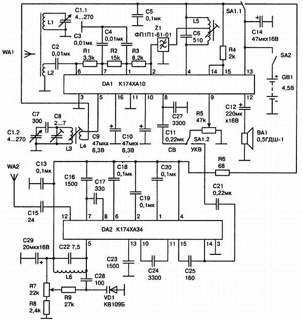 Рис. 18.4. Принципиальная схема карманного СВ-УКВ приемника на микросхемах К174ХА10 и К174ХА34