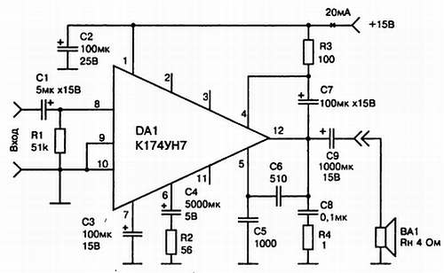 Рис. 18.6. Типовая схема УЗЧ на микросхемы К174УН7