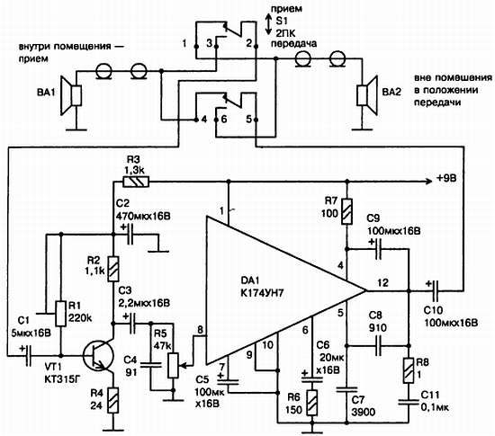 Устройство собирается на печатной плате размером 50x50 мм и помещается в корпус, в котором также размещаются переключатель S1, источник питания и один из динамиков. Второй динамик, например ВА2, размещают вне помещения. При использовании исправных деталей, собранное устройство начинает работать сразу и особой наладки не требует. Резистором R1 устанавливают чувствительность устройства, а резистором R5 – мощность выходного сигнала. Переговоры ведутся в таком режиме: вначале один абонент говорит в динамик, например ВА2, а другой слушает (динамик ВА1), потом находящийся в помещении производит переключение в режим передачи переключателем S1 и отвечает, говоря в свой динамик. В устройстве каждая динамическая головка используется одновременно как микрофон и как громкоговоритель.