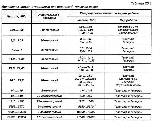 25.1. Диапазоны частот радиолюбительских станцийВ мировом эфире кроме широковещательных и специальных станций можно услышать и радиолюбительские. Радиолюбительская связь осуществляется на специально выделенных частотах в любое время суток телефоном, телеграфом и телетайпом. Телетайп представляет собой специальный передающий аппарат с клавиатурой пишущей машинки. Он автоматически печатает на бумаге информацию, которая передается в эфир. Успех в осуществлении дальних связей зависит от благоприятного прохождения в данный момент радиоволн определенной длины и конструкции радиостанции. Кроме установления связи с дальними корреспондентами, радиолюбители вносят также свой посильный вклад в изучение распространения радиоволн, проводят соревнования по скорости приема и передачи радиограмм, обеспечивают связью различные экспедиции оказавшихся в экстремальных условиях, конструируют радиоэлектронную аппаратуру и антенны. В 1925 г. в нашей стране был создан Международный радиолюбительский союз, который с той поры начал проводить регулярные соревнования радиолюбителей на коротких волнах, а позднее и на ультракоротких. Для любительской радиосвязи выделены участки частот в диапазонах средних, коротких и ультракоротких волн (табл. 25.1). Из таблицы видно, что только в диапазонах 160 м и 10 м указаны конкретные участки для определенных видов излучения, в других диапазонах такого подразделения нет.