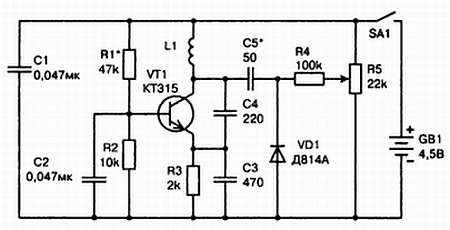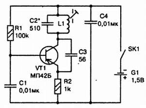 Вместо указанного на схеме транзистора КТ315 можно использовать любые другие высокочастотные транзисторы с коэффициентом усиления 50…100. Катушка L1 бескаркасная и содержит 25 витков провода ПЭВ-1 диаметром 0,7 мм, намотанных на оправке диаметром 12 мм виток к витку. Детали генератора размещаются на печатной плате, изготовленной из фольгированного стеклотекстолита. Если при подключении источника питания ток, потребляемый устройством, составляет около 0,7 мА, то никакой наладки дальше делать не нужно. В противном случае необходимо подобрать резистор R1. В вечернее время включают радиоприемник и настраивают его немного левее отметки 40 м, в сторону более низких частот. В этом месте должны быть слышны неразборчивые звуковые сигналы, напоминающие искаженную речь. Следует как можно точнее настроиться на более сильный сигнал. После располагают генератор возле приемника. Включают генератор и, медленно вращая ось резистора R5, пытаются совместить сигнал генератора и радиолюбительской станции. Иногда для лучшего совмещения приходится сдвигать или раздвигать витки катушки. В момент совмещения непонятные звуки должны стать разборчивыми.