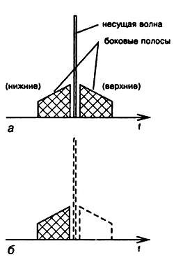 Рис. 25.5. Спектр частот широковещательной радиостанции (а) и SSB сигнала (б)