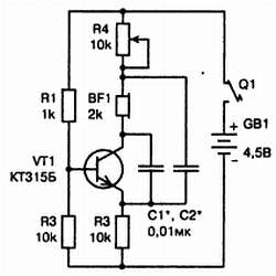 В конструкции этого генератора можно использовать любой маломощный транзистор серий МП39…МП42 со статическим коэффициентом передачи тока 40…60. В качестве контура L1, С2 подойдет контур УРЧ вещательного радиоприемника, либо самодельный, намотав 32x3 витков провода ЛЭШО 5x0,06 на стандартный трехсекционный каркас, и поместить его в ферритовые чашки марки 600НН диаметром 8,6 с подстроечными сердечниками длиной 12 мм из того же материала. Телеграфный гетеродин собирают на небольшой печатной плате и помещают внутри корпуса приемника недалеко от каскадов УРЧ. Подбирая емкость конденсатора С2 или вращая сердечник катушки, устанавливают наиболее приемлемую тональность телеграфных сигналов.