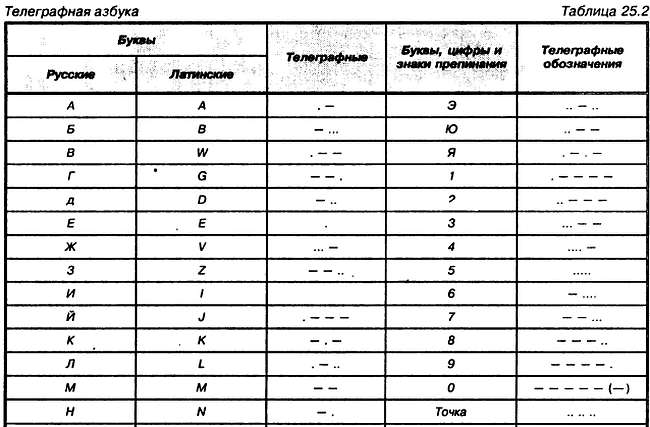 Изучать азбуку Морзе лучше всего вдвоем с товарищем или в группе, один передает сигналы Морзе, а другой их принимает. Телеграфная азбука Морзе приведена в табл. 25.2.
