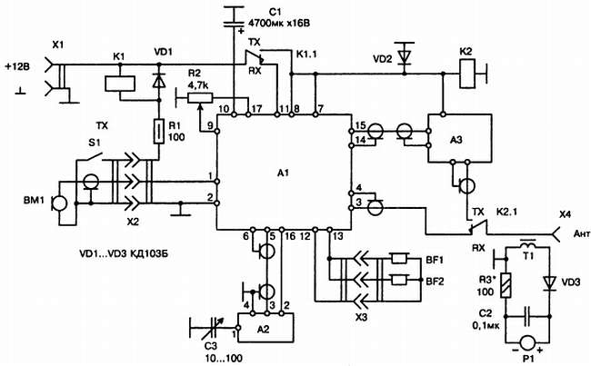 В обозначениях деталей первая цифра указывает номер узла, в котором находится деталь. В режиме приема ВЧ сигнал поступает через антенный разъем Х4, контакты антенного реле К2.1 на основную плату А1 (рис. 25.9). Сигнал, выделенный двухконтурным полосовым фильтром, подается на вывод 3 смесителя 1DA1 (рис. 25.10). На выводы 5, 7 через контакты реле 1K1.1 и трансформатор 1Т1 поступает напряжение ГПД. Нагрузкой смесителя является ЭМФ 1Z1, который выделяет сигнал ПЧ нужной боковой полосы. С выхода ЭМФ сигнал поступает на выводы 2, 3 смесителя 1DA2. На выводы 5, 7 этой микросхемы через контакты реле 1К1.2 и трансформатор 1Т2 поступает напряжение кварцевого гетеродина. Нагрузкой смесителя по звуковой частоте является резистор 1R6. Через фильтр нижних частот, состоящий из элементов 1С16, 1L6, 1С23, сигнал звуковой частоты поступает на усилитель 1DA3 с коэффициентом усиления около 40 дБ и далее на головные телефоны (наушники). Регулировка усиления приемного тракта производится переменным резистором R2 путем изменения питающего напряжения микросхемы 1DA1.