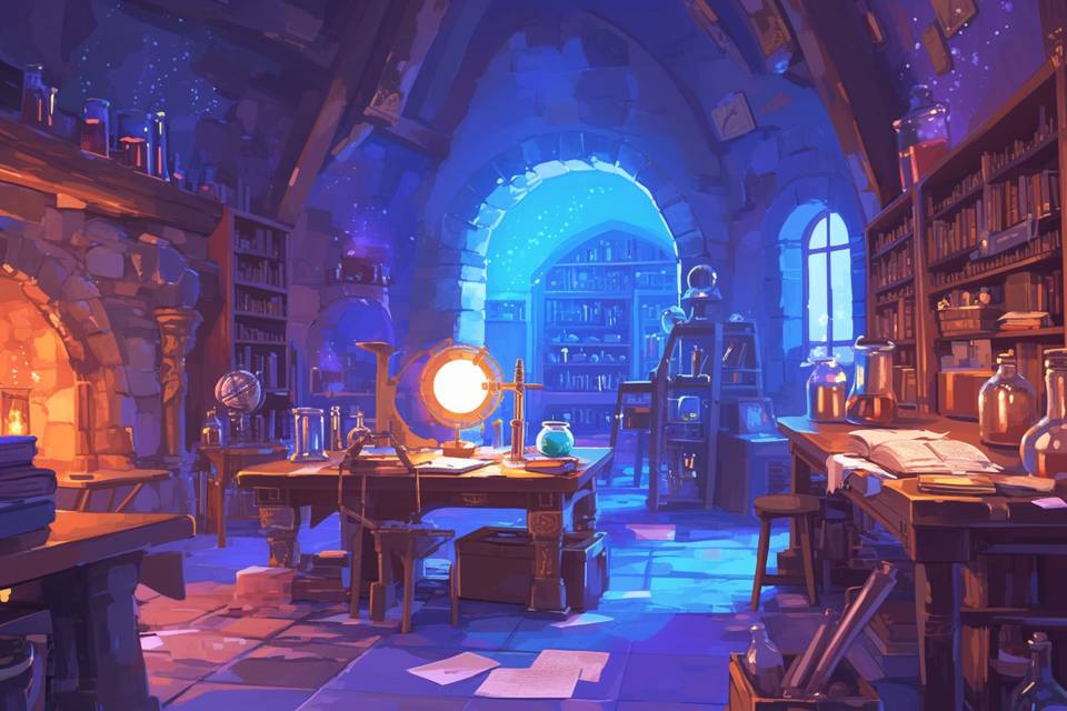 Перед нами открылся просторный зал. В центре стоял рабочий стол. Вдоль каменных стен, какого добра только не было! Десятки книжных полок, стеллажи с зельями и сушёными ингредиентами, два кузнечных стола и…