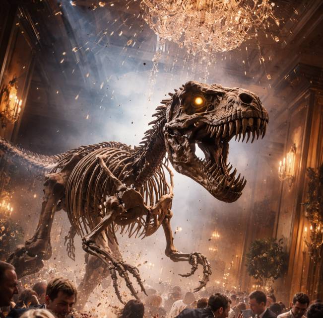 Скелет тирекса, который минуту назад стоял неподвижно, теперь двигался на своём постаменте. Пустые глазницы словно смотрели на разбегающихся гостей.