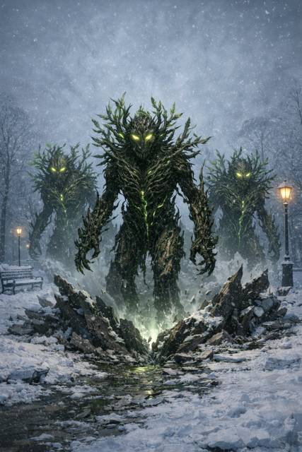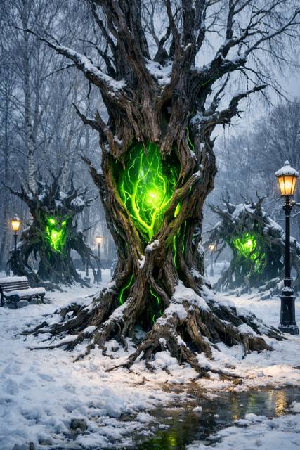 Сначала толстые, как стволы обычных деревьев, ветви. Покрытые острыми шипами. Потом показалась крона: густая, с ярко-зелёными листьями, что выглядело совершенно дико посреди заснеженного зимнего парка. Листья шевелились сами по себе, издавая тихий шелест, похожий на шёпот.