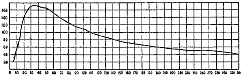 Для каждого измерения Столетов вычисляет и значение функции намагничения, разделив величину намагниченности образца на соответствующее значение напряженности магнитного поля. Для функции намагничения он также вычерчивает график. Кривая этого графика похожа на очертания дюны. Крутая со стороны, соответствующей измерениям, произведенным в слабых полях, она полого спускается в области сильных полей.