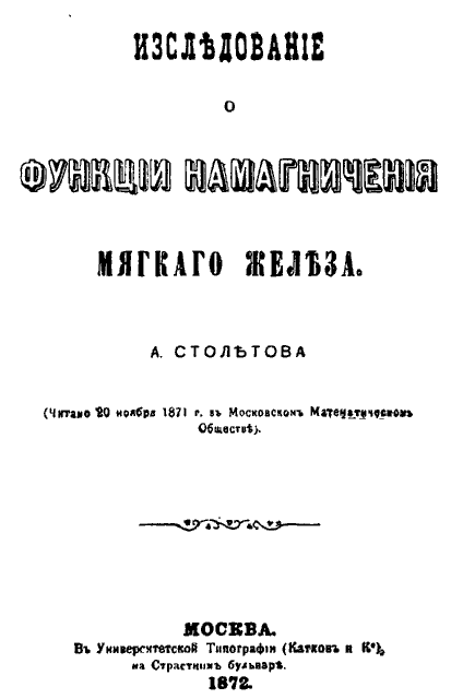 Титульный лист книги Столетова «Исследование о функции намагничения мягкого железа».