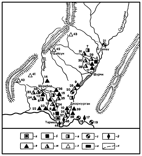1 – Старый Термез; 2 – Дальверзинтепе; 3 – Зартепе; 4 – Хаиттепе; 5 – Талашкантепе; 6 – Дшандавляттепе; 7 – Дегризтепе; 8 – Хайрабадтепе; 9 – Караван-Тушту; 10 – Ялпактепе; 11 – Дшартепе; 12 – Чоргультепе; 13 – Кулуг-Шахтепе; 14 – Бабатепе; 15 – Безымянное (Б – 37); 16 – Каттатепе; 17 – Ходжа-Гульсуар; 18 – Айртам; 19 – Хатын-Рабат; 20 – Бараттепе (Байтепе); 21 – Халчаян; 22 – Кампыртепе; 23 – Шуробкурган; 24 – Шортепе; 25 – Арпа-Паятепе; 26 – Барауз; 27 – Ходжа-Камар; 28 – Савринджонтепе; 29 – Ишанбобо; 30 – Маслахаттепе; 31 – Мазартепе; 32 – Чаллатепе; 33 – Чопоната; 34 – Ходжа-Кия; 35 – Икизактепе; 36 – Аиртепе; 37 – Безымянное (Б – 40); 38 – Актепе; 39 – Исмаилтепе; 40 – Дабилкурган; 41 – Майданкурган; 42 – Байсунское; 43 – поселение у с. Сина; 44 – «греческая переправа» через Амударью в Термезе; 45 – переправа через р. Сурхан.