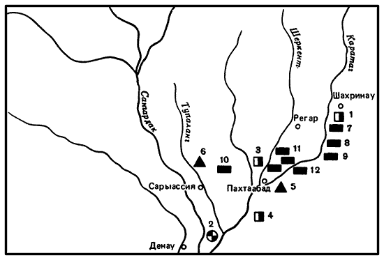 1 – Шахринауское городище; 2 – Халчаян; 3 – Узбеконтепе; 4 – Бешкала; 5 – Курганча; 6 – Караултепе; 7 – Кампыр-Зухро; 8 – Безымянное тепе (95); 9 – Аккурган; 10 – Караултепе; 11 – группа тепе у с. Курган-Куса; 12 – тепе в с. Минг-Тут.